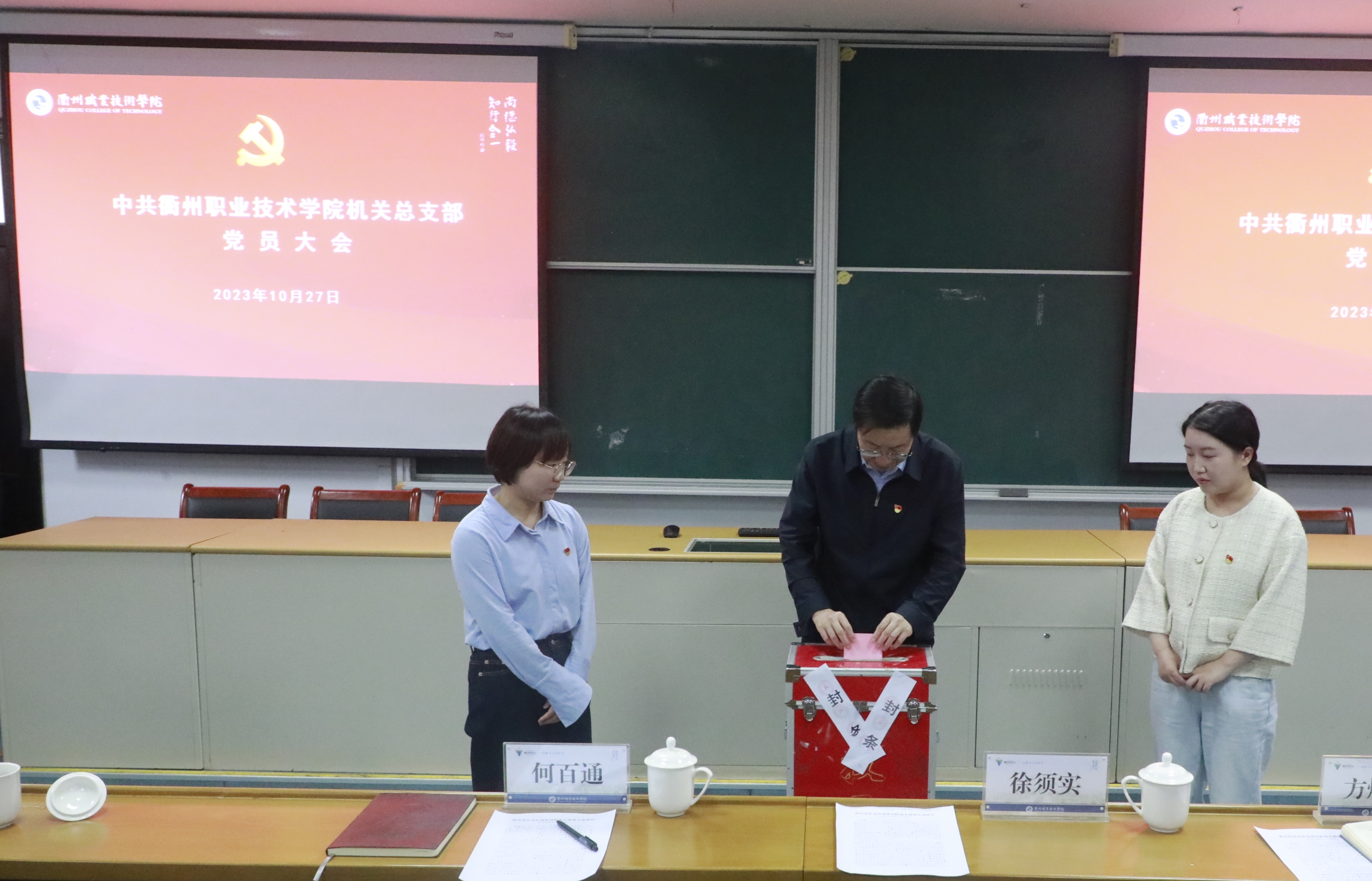 大会首先宣读了《中共衢州职业技术学院委员会关于同意机关党总支补选委员请示的批复》文件。根据《中国共产党章程》《中国共产党基层组织选举工作条例》等相关规定,会议审议通过了党员大会选举办法,推选了监票人、计票人。大会采取无记名投票和差额选举的办法进行补选,选举产生3名机关总支部委员。