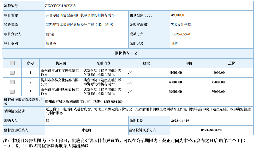 衢州职业技术学院共富学院《造型基础》教学资源的拍摄与制作自行采购信息公示