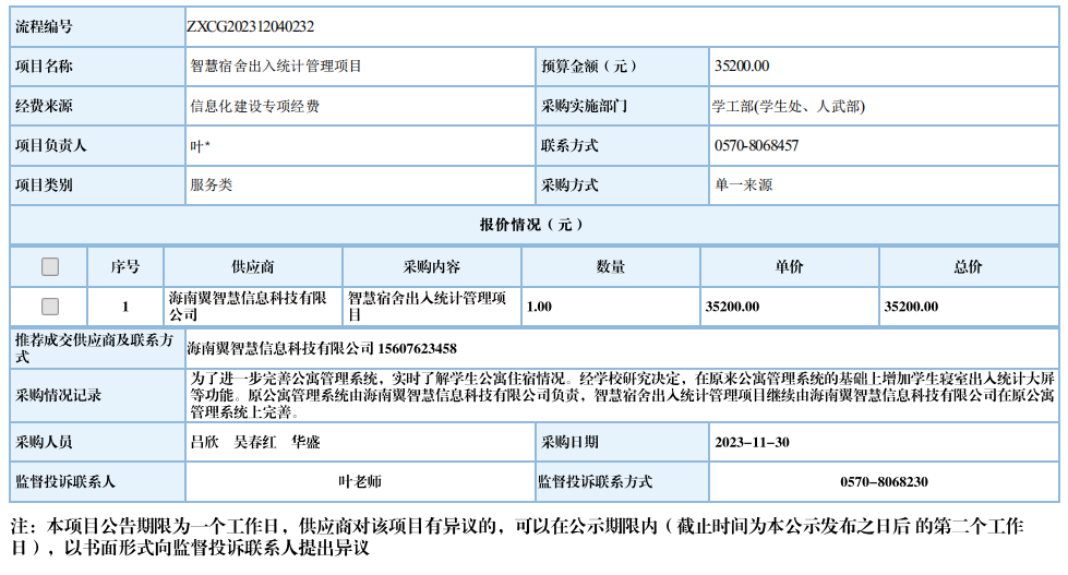 衢州职业技术学院智慧宿舍出入统计管理项目自行采购信息公示