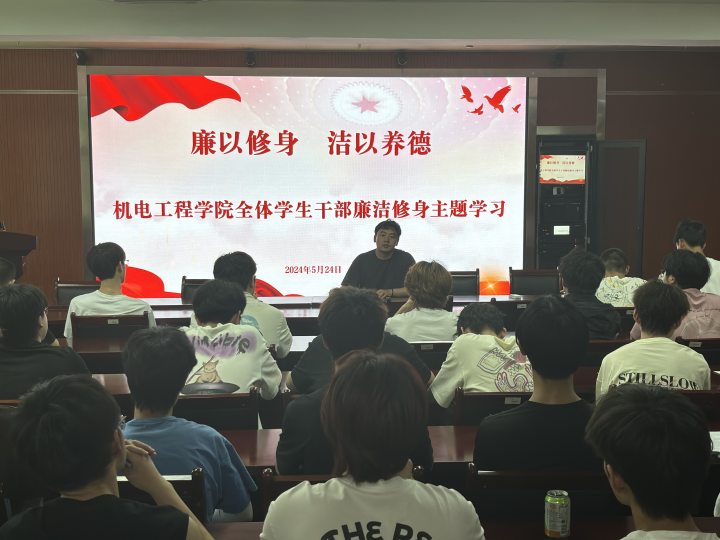 为深入贯彻落实党的二十大精神,落实立德树人根本任务,进一步培育清廉文化氛围,建设风清正气、廉洁和谐的校园文化。近日,机电工程学院在机电大楼303开展了“全体学生干部廉洁修身主题学习”。机电工程学院辅导员何韧之,学生会干部和各班班长出席本次会议。