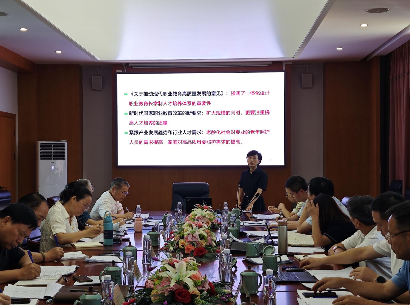 老年护理专业主任史路平汇报五年制中高职一体化护理专业人才培养方案修订情况,与会人员展开热烈研讨。