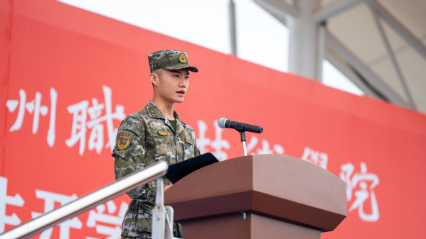 吕延文讲话。他代表全校师生员工,对2807位新同学表示热烈的欢迎!向新生们的家长、老师致以崇高的敬意!向承担本次新生军训任务的全体教官表示衷心感谢!他希望,广大青年学生要勇立“鸿鹄之志”,将“专业”融入“事业”,成长为筑梦强国的衢职人。把专业理论与实践探索结合起来,把专业所能与事业所需结合起来,把个人进步与国家发展结合起来,成长为强国建设的中流砥柱。要锤炼“工匠之技”,将“技术”融入“技能”,成长为技能报国的衢职人。努力践行“尚德弘毅,知行合一”的校训,从专业中学习技术知识,在实践中掌握技能本领,努力成长为可堪大用、能担重任的栋梁之材。要常怀“赤子之心”,将“小我”融入“大我”,成长为胸怀家国的衢职人。厚植家国情怀,淬炼青春本色,跳出“舒适圈”,打破“天花板”,不“躺平”、不“摆烂”,把个人理想追求融入党和国家事业之中,争当“强国有我”的“新时代好青年”。