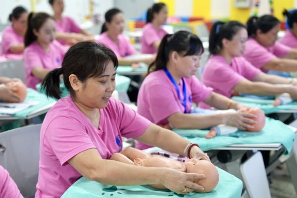 9月5日,在位于衢州职业技术学院的2024年衢州保姆(月嫂)高级培训班内,学员们正在老师的指导下进行实操练习。此次培训班通过理论讲授、实训教学和顶岗实习等多种方式相结合,全面提升学员的专业技能水平。此举不仅有助于学员更好地融入市场,更为“衢州保姆”品牌的持续升级和家政服务行业的健康发展注入了新的动力。