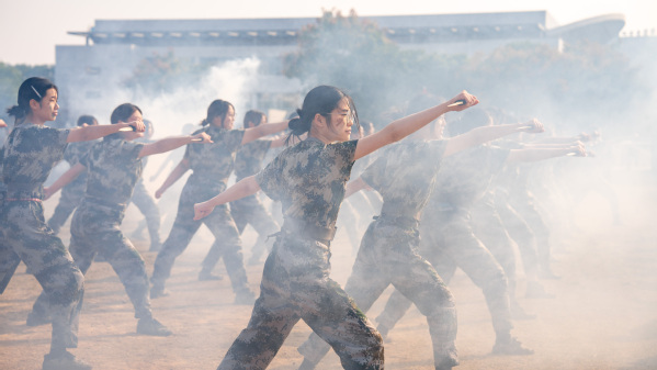 承训教官为全体新生表演了战术、格斗和武术,迅疾的动作尽展飒爽英姿,每一声喊杀都气势磅礴,精彩的表演赢得了现场观众的阵阵掌声和欢呼声。