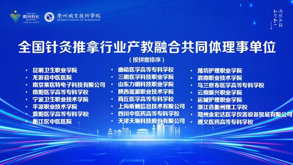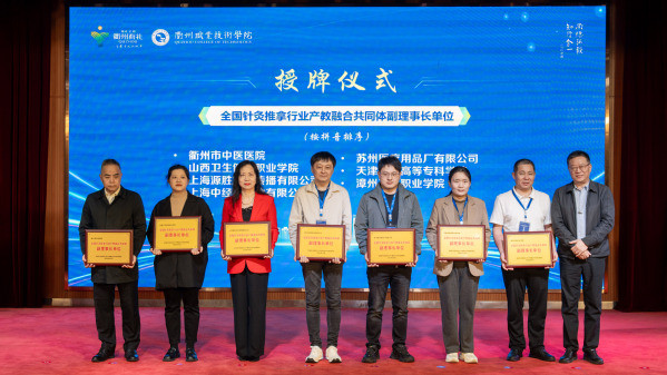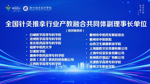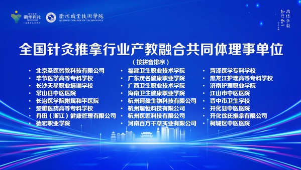 10月29日,召开了全国针灸推拿行业产教融合共同体成立预备会议,选举了浙江中医药大学、安徽中医药大学第二附属医院(安徽省针灸医院)、衢州职业技术学院、安徽中医药高等专科学校和浙江绿康医养集团股份有限公司等5家单位为共同体理事长单位。