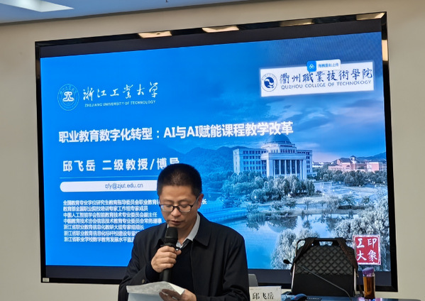 为深入贯彻落实党的二十届三中全会精神,围绕学校“新双高”建设工作,聚焦构建数字化教学新生态,推动学校高质量发展,11月25日下午,浙江工业大学职业技术教育学院原院长、二级教授、全国教育专业学位研究生教育指导委员会职业教育领域专家工作小组副组长邱飞岳教授应邀来校作《职业教育数字化转型:AI与AI赋能教学改革》专题讲座。党委委员、副校长余建军主持,全体中层干部及基层教学组织负责人100余人参加。