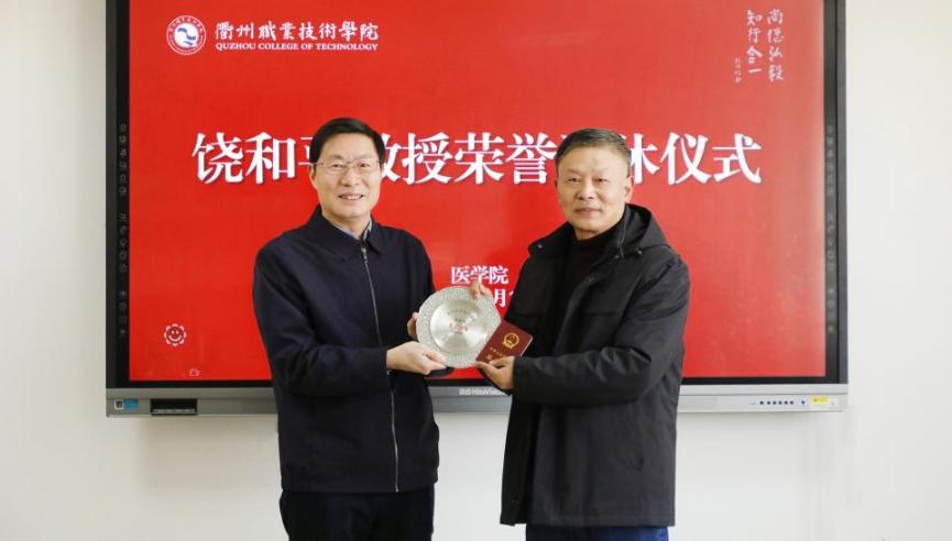 徐须实代表校党委向饶和平同志光荣退休表示热烈祝贺,对饶和平同志多年来为学校发展作出的贡献表示感谢。徐须实说:“饶和平教师就是我心目中高校教师应有的模样”。他高度赞扬了饶教授是老卫校复建的创建者、衢职院医学系的奠基者、衢职院科研和社会服务工作的开拓者,为医学院、衢职院高质量发展,作出了突出贡献。他希望饶和平教授退休不褪色、离职不离情,持续关心支持学校建设发展;医学院要传承弘扬70多年办学传统,锚定“新双高”、职教本科奋斗目标,为学校发展建设增添正能量、再作新贡献。