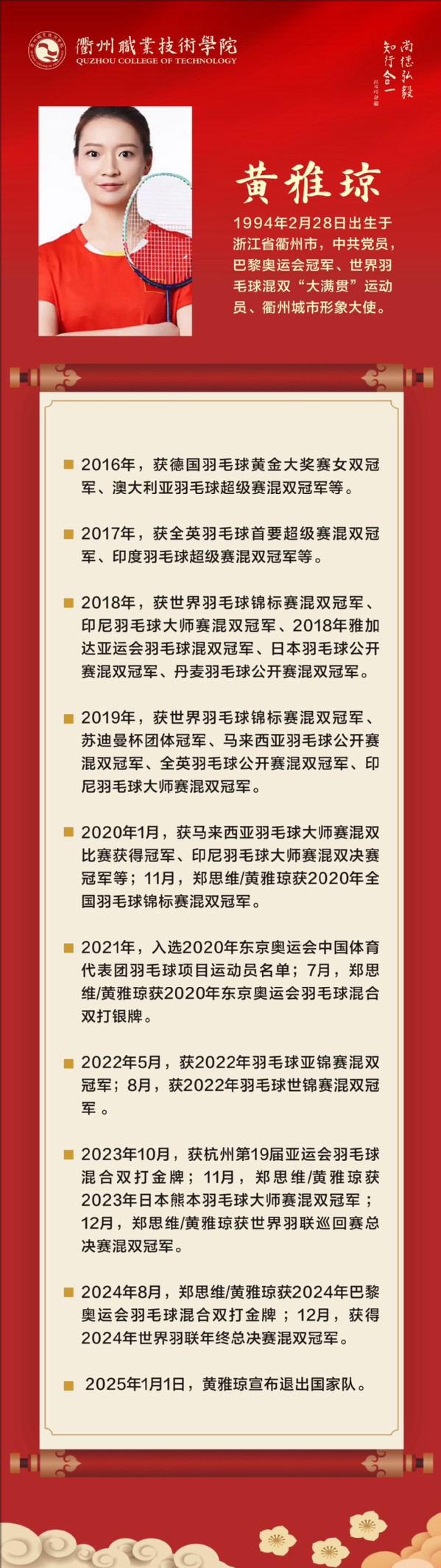 1月6日上午,衢州职业技术学院雅琼体育学院揭牌仪式在校体育馆举行。巴黎奥运会冠军、世界羽毛球混双“大满贯”运动员、衢州城市形象大使黄雅琼受聘为雅琼体育学院名誉院长并为学院揭牌。