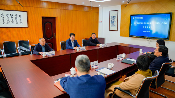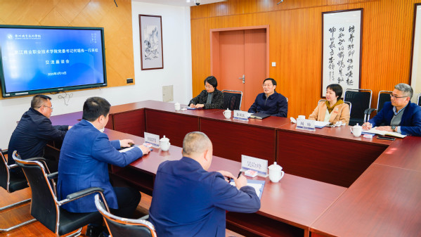 3月18日下午, 浙江商业职业技术学院党委书记何瑶伟一行来校交流,校党委书记徐须实,党委委员、组织部部长周帅陪同。
