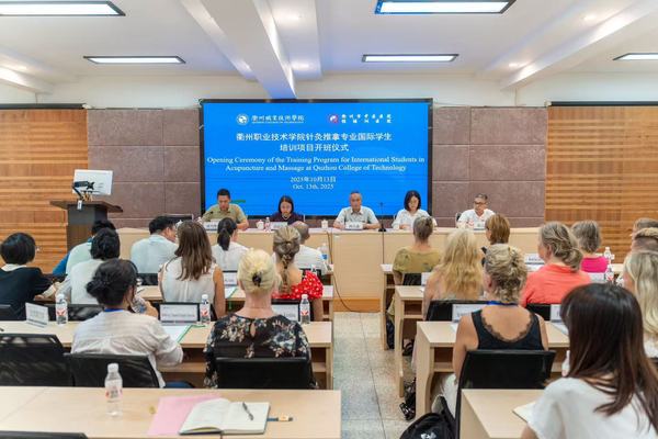 据悉,2024年11月,学校招收了第一期来自瑞典斯德哥尔摩针灸学院22名学员,开展了为期三周的针灸推拿专业培训任务。今年9月下旬,我校医学院院长邱惠萍教授带队赴瑞典斯德哥尔摩参加了世界针灸学会联合会2025国际针灸学术研讨会,并在开幕式上揭牌“杨继洲学院(瑞典)”,以推广杨继洲针灸学术及文化,期间与斯德哥尔摩针灸学院Peter Torsell校长会面,在学员培训工作方面进行了深入交流。本期培训从10月13日至11月7日,为期近一个月。培训课程由我校与衢州市中医医院联合精心设计,主要包括核心的临床实习模块、丰富的中医理论与实操课程、独具特色的传统养生与文化体验、聚焦经典的杨继洲针法传承等四大模块。临床实习模块将在衢州市中医医院针灸推拿科完成为期四周、共计18次的门诊实习,近距离观察并参与针灸推拿的诊疗全过程,在实践中深化理解。中医理论与实操课程模块将系统学习脉诊、舌诊、中医体质评估等诊断技法,亲手操作针刺、艾灸、刮痧、拔罐、耳穴压豆等传统疗法,并专项研修颈肩腰腿痛推拿、中医美容、针灸减肥、膝关节疼痛等特色治疗课程。传统养生与文化体验模块安排了八段锦、五禽戏等传统中医体育保健课程,同时,还将组织学员前往针灸文化园体验杨继洲针灸非遗文化,参观孔氏南宗家庙,感受“南孔圣地”的儒风雅韵,深度体验衢州的地域文化魅力。