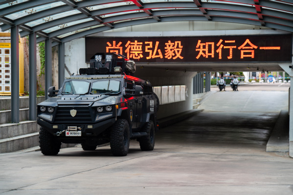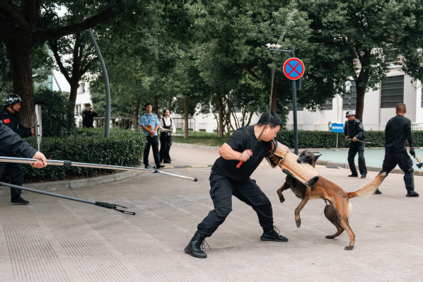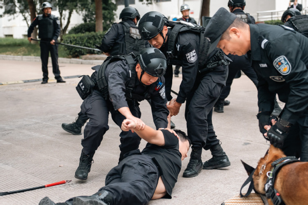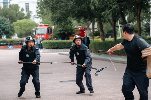 反恐防暴演练开始,一辆社会车辆从西门冲入我校,被我校安保人员用车辆阻断器逼停至二号公寓前,两名社会闲散人员拿出随身携带刀具下车开始威胁校内学生,我校保安与其一直周旋,接警赶到的特警人员口头警告歹徒,歹徒毫无收敛之意继续用刀砍特警人员,在特警人员武力压制下,歹徒被制服,特警迅速将歹徒抬离现场。