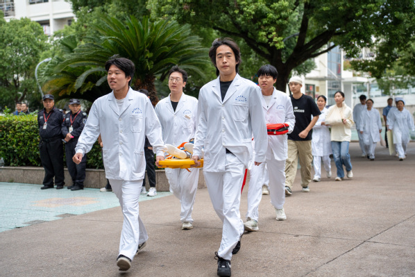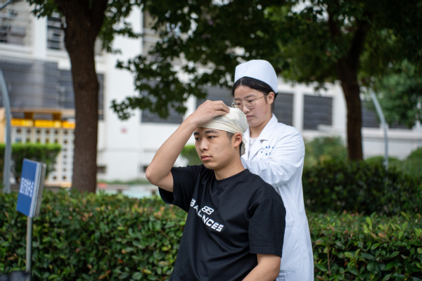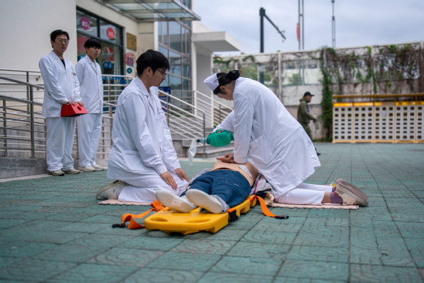 在医疗救护演练中,医护人员携带担架和救护药品将伤员从3号公寓抬到救护点进行心肺复苏救治,对受伤人员进行伤口包扎救治,包扎救治后将伤员抬上救护车送医院继续进行治疗。
