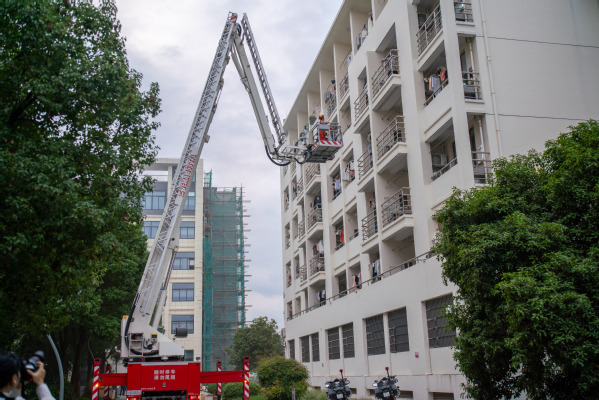 在3号学生公寓6楼,智慧新城消防大队接警后派出登高救援车对我校被困学生开展救援,将被困学生救至安全地带。