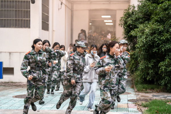 反恐防暴演练结束后,随即开展消防疏散演练。当发现烟雾从着火点阳台飘出的火情信息后,公寓值班员立即拔打校园119报警,消防监控值班室接警后,立即电话报告现场指挥员,现场指挥员即刻启动应急预案,下达消防演练开始的指令,现场响起了警报声,公寓辅导员和管理员立即引导学生疏散,同学们一边用湿毛巾或身上的简便器材护住口鼻,按照预定逃生路线迅速疏散到指定地点。