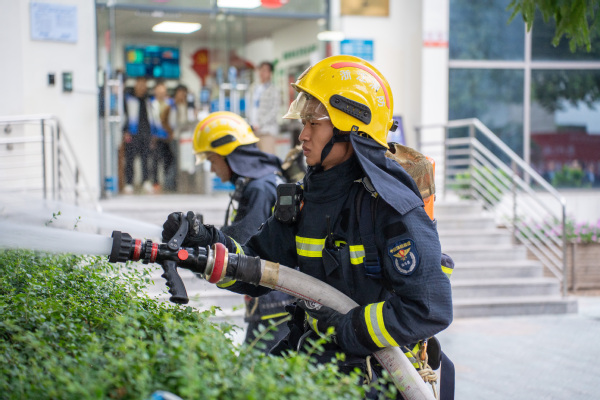 灭火行动组携带灭火器和消防水带奔赴着火现场开展灭火救援工作,火情控制住后,物资抢运组的消防志愿者将现场抢救出来的贵重物品,运送到指定地点。