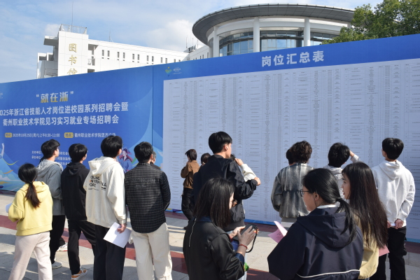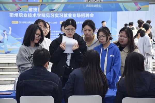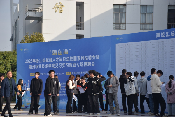 为深入贯彻党中央、国务院“稳就业”“保就业”决策部署,落实省委、省政府就业工作要求,充分发挥校园招聘会就业主渠道作用,10月25日,“就在浙”2025年浙江省技能人才岗位进校园系列招聘会暨衢州职业技术学院见习实习就业专场招聘会在我校思齐广场成功举办。本次活动由浙江省人力资源和社会保障厅主办,浙江省职业介绍服务指导中心、衢州市人社局、衢州智造新城产教联合体及衢州职业技术学院联合承办,旨在为2026届毕业生搭建实习就业对接平台,助力学生高质量实习、尽早就业。