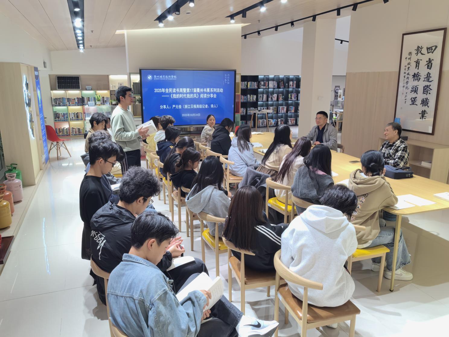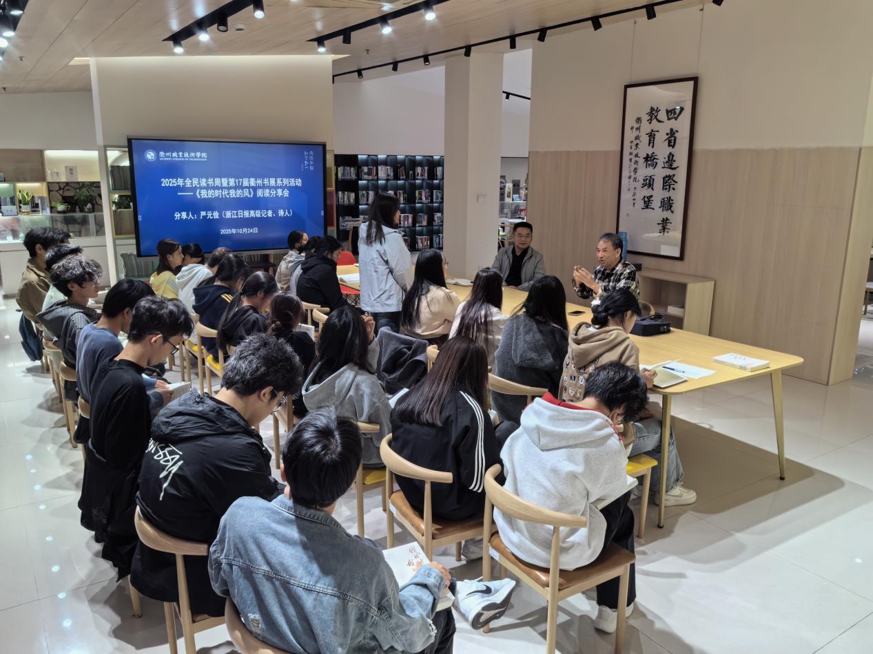 在2025年全民读书周暨第17届衢州书展的浓厚氛围中,10月24日,衢州职业技术学院图书馆特邀浙江日报高级记者、诗人严元俭,以其长篇“诗自传”《我的时代我的风》为载体,为师生带来一场兼具文学厚度与时代温度的阅读分享会,现场氛围热烈而动人。