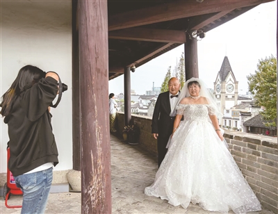 10月下旬,年过七旬的柴岳华通过三衢客户端报名参加了衢州市“我们的节日・重阳”金婚老人婚纱照补拍活动后,时常向主办方打听拍摄进程。10月26日,有5对金婚老人在衢州古城文化旅游区水亭门历史文化街区完成了拍摄,而柴岳华夫妇的婚纱照补拍则安排在本周末。
