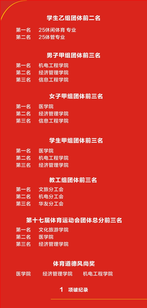 经过两天的激烈角逐,运动会于31日下午圆满落幕。本届运动会共有12个学生代表团,13支教工代表队参加了比赛,1个项目打破了校运会纪录。