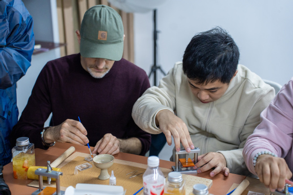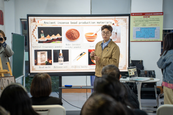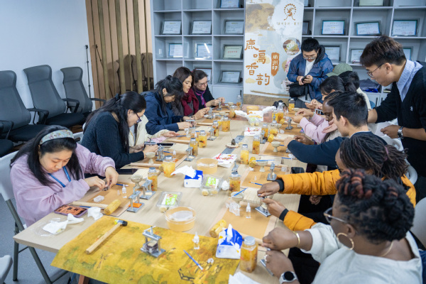 在我校学生创新创业团队“鹿鸣香韵·衢州印”的悉心指导下,他们亲手制作了非遗中药香珠,在馥郁的药香环绕中,团队不仅娴熟地演示了香珠的古法配方、手工打磨与串制技艺,生动传达了每一道工序所蕴含的中医药“未病先防”的防疫智慧与“闻香祛病”的健康理念,更以流利的英语分享了他们致力于中医药文化创造性转化的创业历程。