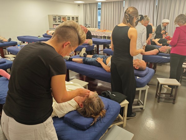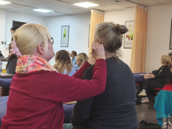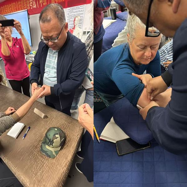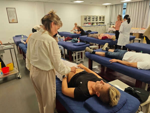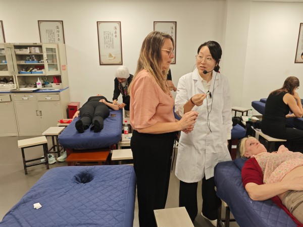 学校还特邀国家级非物质文化遗产第五代传承人、浙江省劳动模范、我校客座教授金瑛亲授《杨继洲针法》专项课程。金瑛介绍了下手八法、十二字分次第手法等,学员们围在操作台前,认真记录针尖的角度、深度和运针节奏。在实践环节,金瑛为留学生们精心设计了个性化的治疗方案,手把手指导每位学员体验“刺、捻、提、插”的精妙手法,留学生们争先恐后尝试,“随着银针缓缓深入,刚开始略微有些刺痛,”留学生感慨到,“后来仿佛一股微弱的电流在体内轻轻扩散,局部产生酸、麻、胀的复合感觉,起针之后,仿佛打开了堵塞的通道,感到全身的轻松和畅快。”