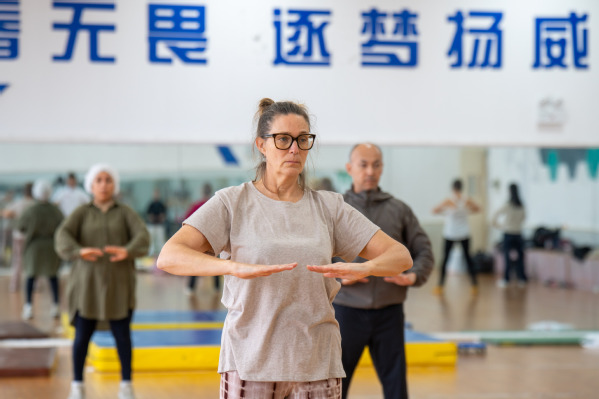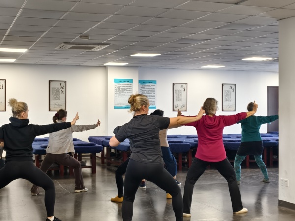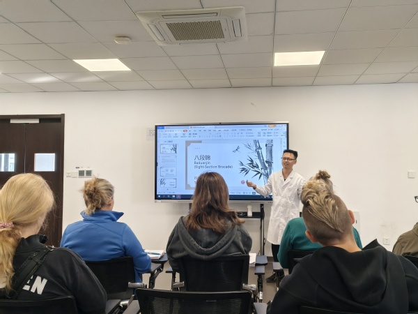 八段锦、五禽戏因其独特的动作设计深受留学生们偏爱,他们惟妙惟肖地模仿虎鹿熊猿鸟的动作形态,时而如猛虎扑食之势,时而轻盈似鹿跃于山间,一招一式、动静相兼,在舒展肢体间体验“形神共养”的中医养生智慧。
