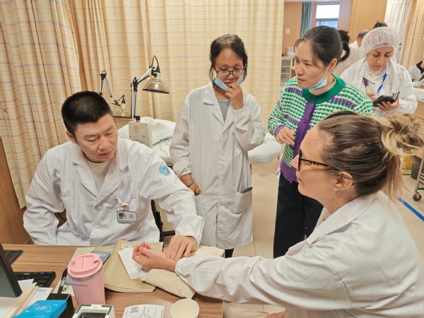 脉诊理论及实践课上,在带教老师的指导下,留学生们将手指轻轻搭在腕间,屏息凝神地细心体会浮、沉、迟、数等不同脉象。