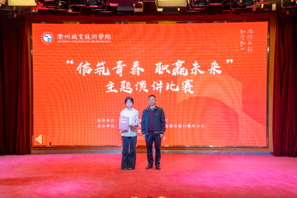 为加强学生诚信教育,树立正确信用观念,我校联合中国建设银行衢州分行、中国人寿衢州分公司,在中国人民银行衢州市分行指导下成功举办了“信筑青春 职赢未来”主题演讲比赛。