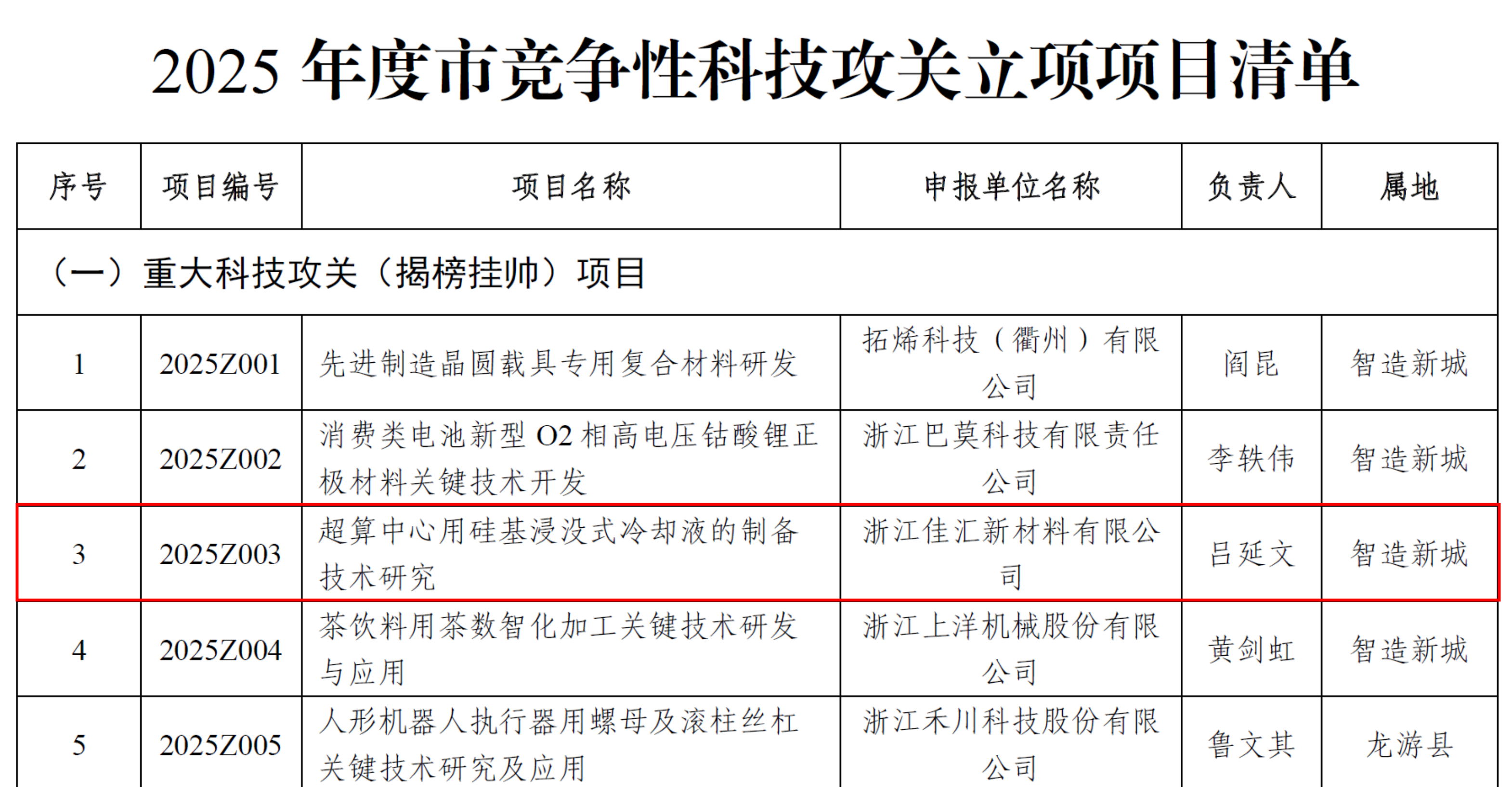 近日,衢州市科学技术局公布了2025年度衢州市重大科技攻关(揭榜挂帅)项目立项名单。由我校党委副书记、校长吕延文教授带领的项目研究团队,依托浙江佳汇新材料有限公司申报的“超算中心用硅基浸没式冷却液的制备技术研究”项目得到专家的一致认可,获得市重大科技攻关(揭榜挂帅)项目立项,这是该团队继主持浙江省“尖兵领雁”项目后又一个重大项目立项。