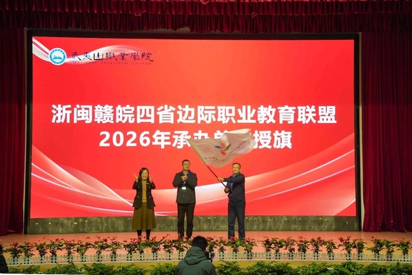 现场还举行了浙闽赣皖四省边际职业教育联盟新增师资队伍建设工作委员单位授牌仪式,以及浙闽赣皖四省边际职业教育联盟第五届直播创业大赛颁奖仪式和联盟2026年工作会议承办单位交接仪式。学校党委委员、副校长徐浪静为新增师资队伍建设工作委员会主任单位——武夷山职业学院授牌。学校党委副书记、校长吕延文为联盟2026年工作会议承办单位——黄山职业技术学院授旗。