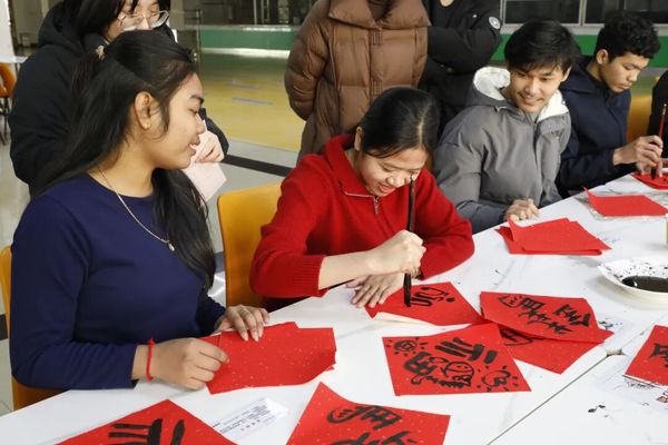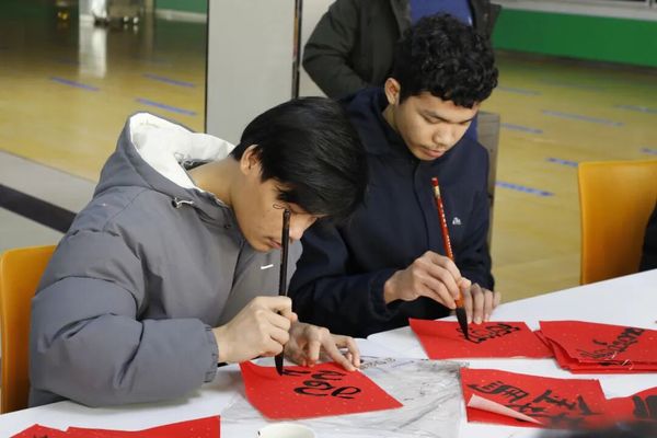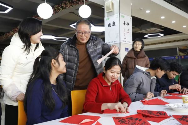 红纸铺开,墨香淡淡。留学生们第一次握起毛笔,笔尖微颤,小心翼翼描摹着“福”字的轮廓,有人用柬埔寨语写下“新年快乐”,两种文化在红纸上交叠,这一刻,团圆不分国界,祝福不拘言语。留学生们端详着自己刚写完的“福”字,笑着说:“我要贴在宿舍门上,这是我在中国过的第一个年。”
