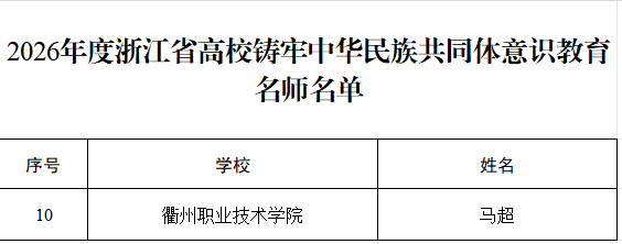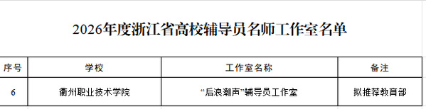 近日,浙江省教育厅发布了《2026年度省高校思想政治工作质量提升综合改革与精品建设项目立项名单的通知》,我校2个项目成功入选。其中,骆黎阳老师负责的《“后浪潮声”辅导员工作室》入选浙江省高校辅导员名师工作室,并被推荐至教育部参评。马超老师入选浙江省高校铸牢中华民族共同体意识教育名师。