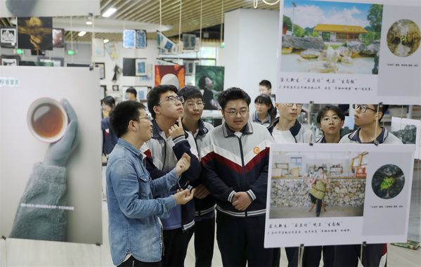 摄影摄像技术专业学生向城南初中学生介绍自己的获奖作品。