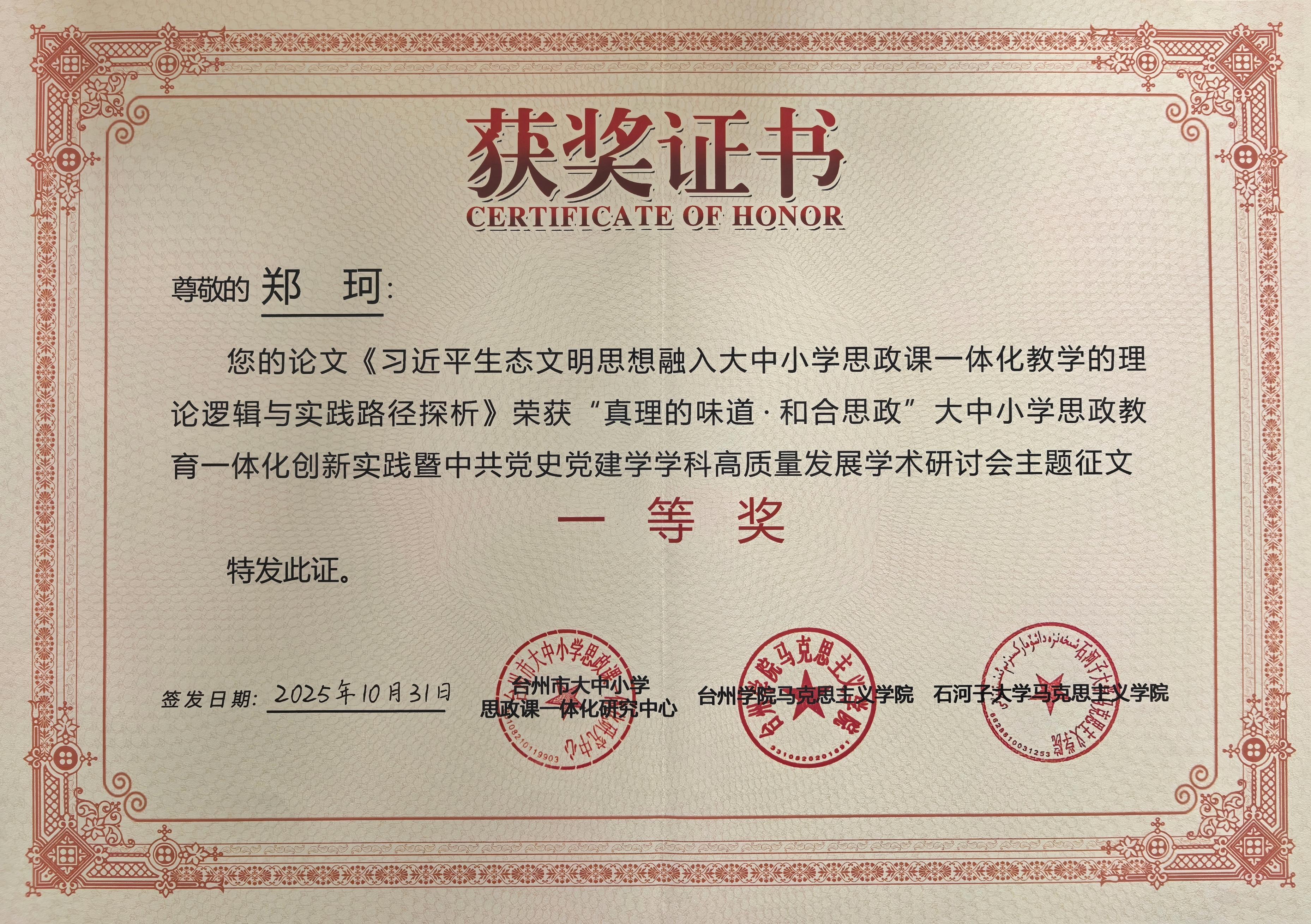 此前,郑珂老师另一篇论文《习近平生态文明思想融入大中小学思政课一体化教学的理论逻辑与实践路径探析》,也在由多所高校联合主办的 “真理的味道・和合思政” 大中小学思政教育一体化创新实践学术研讨会主题征文中荣获一等奖。该论文立足生态文明建设时代要求,为思政课一体化教学融入生态文明教育提供了有益参考。