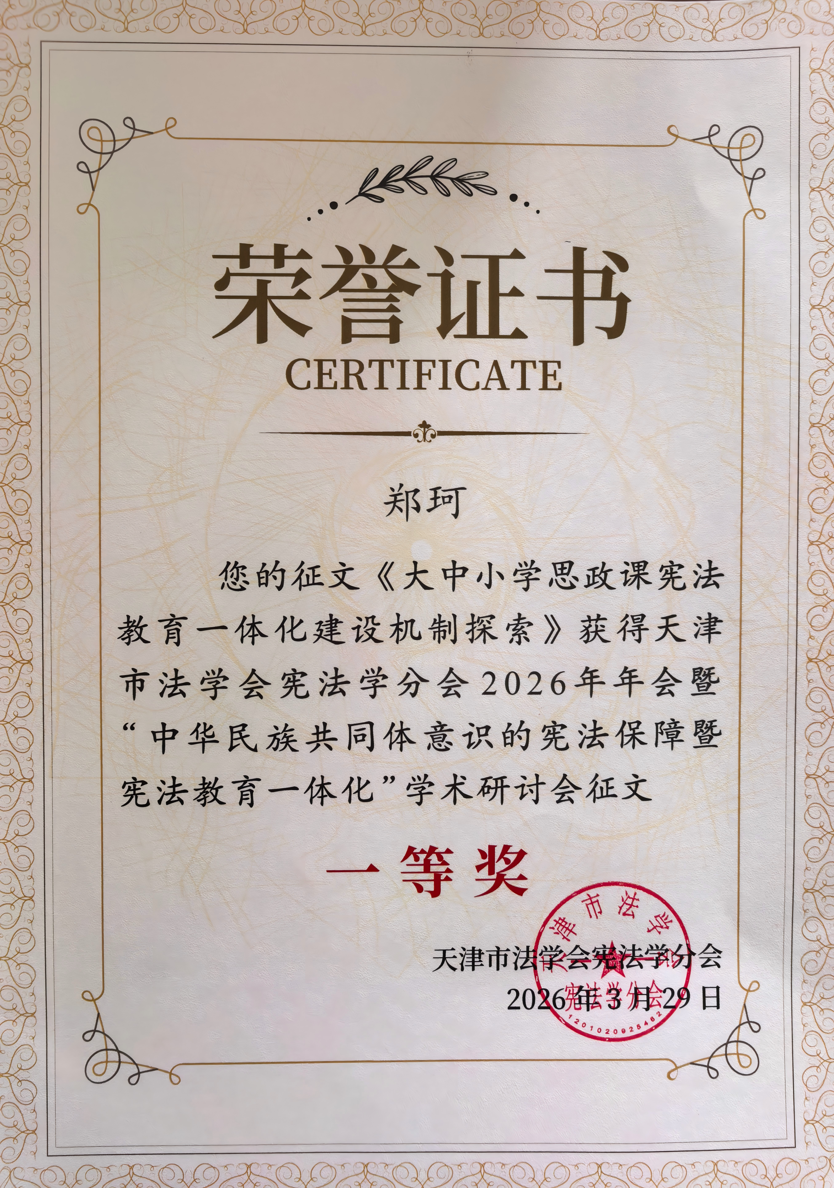 郑珂老师的论文《大中小学思政课宪法教育一体化建设机制探索》,在天津市法学会宪法学分会主办的2026年年会暨 “中华民族共同体意识的宪法保障暨宪法教育一体化” 学术研讨会征文中荣获一等奖。该论文聚焦新时代思政课宪法教育一体化建设,为推动宪法教育贯穿思政课全学段提供了兼具理论深度与实践价值的方案,得到与会专家高度认可。