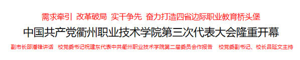 4月27日上午,中国共产党衢州职业技术学院第三次代表大会在图书馆一号报告厅开幕。这次大会是在“十五五”开局,衢州全面推动四省边际中心城市和长三角内陆开放桥头堡地位更加彰显、全力呈现共同富裕和基本实现社会主义现代化市域实践生动图景的关键节点,召开的一次重要会议。大会的主题是:高举习近平新时代中国特色社会主义思想伟大旗帜,锚定“三新”目标,坚持需求牵引、改革破局、实干争先,加快建设特色鲜明的高水平高职院校,奋力打造四省边际职业教育桥头堡!